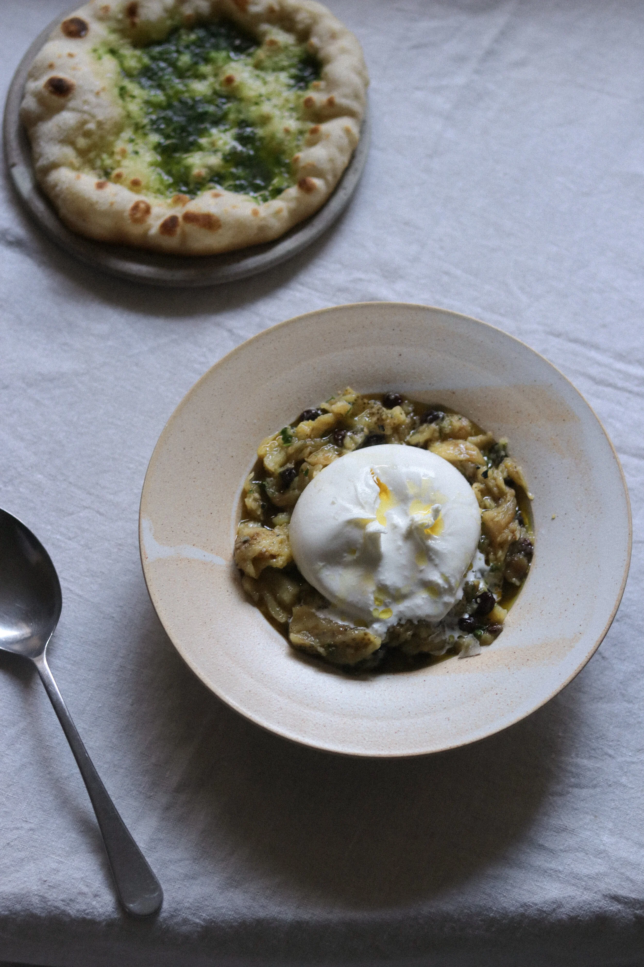 Nettle pesto beans with crème fraîche, hazelnut pangrattato and mint