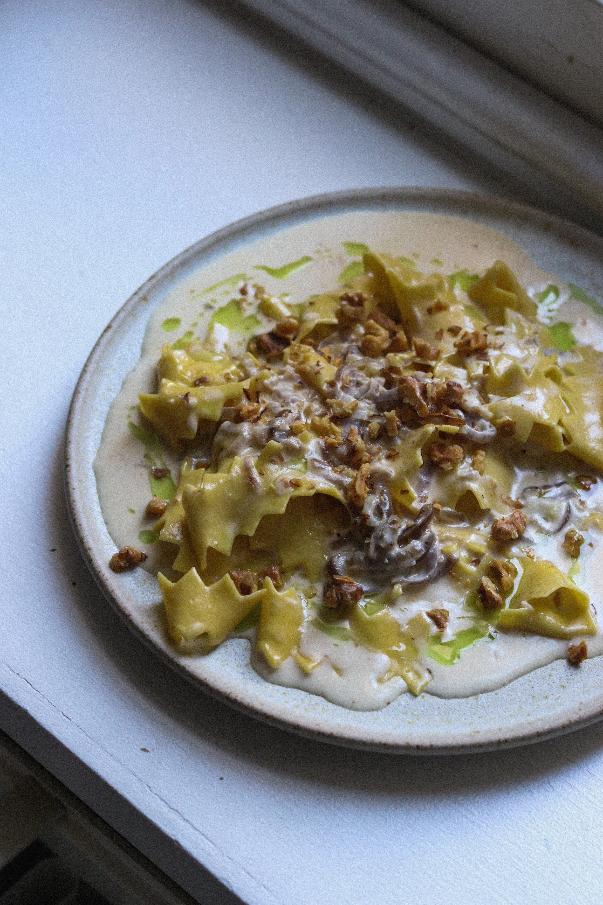 Pasta with taleggio, slow cooked sweet onion, walnuts and chive oil