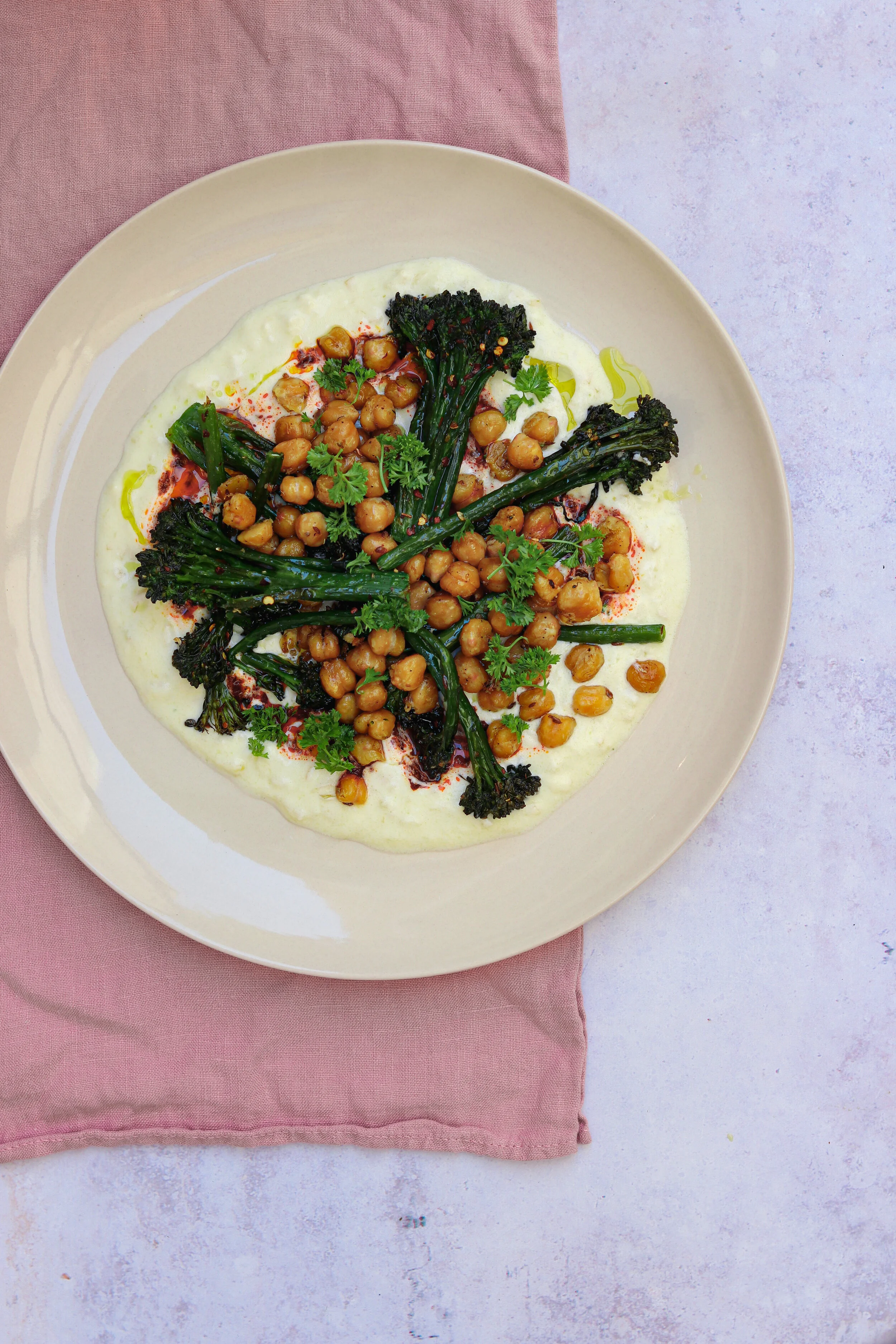 Roast broccoli and chickpeas with preserved lemon yogurt and harissa