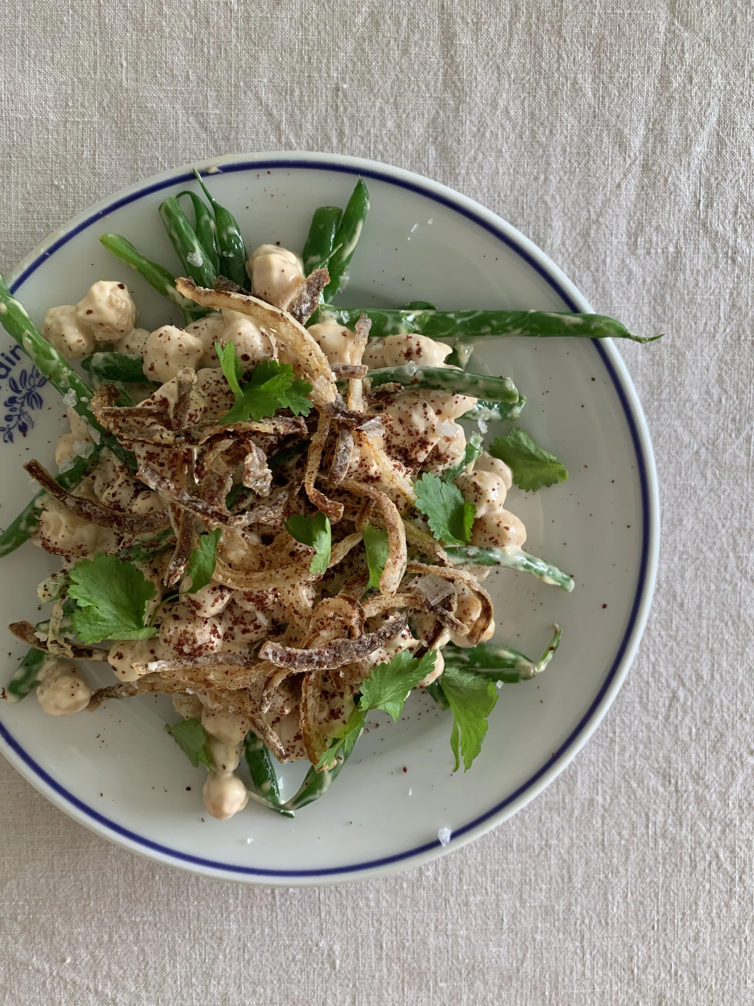 Chickpea and green bean salad with preserved lemon mayonnaise and crispy onions