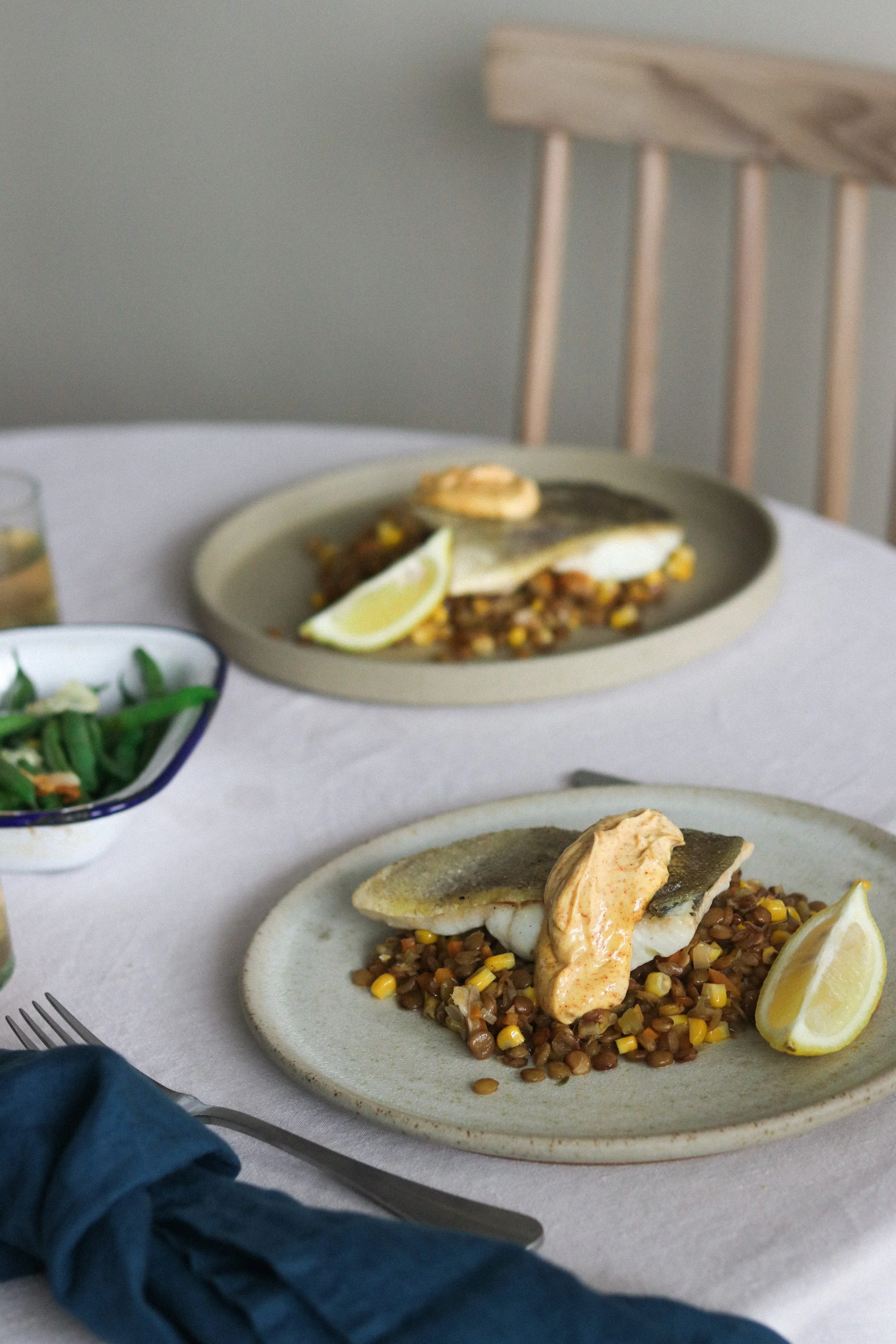 Lentils are a great match for white fish and one of my favourite ways to eat them is starting with soffrito to build in flavour and serving it with some sort of punchy condiment, some favourites of mine being aioli or salsa verde. Sweetcorn is bang in season at the moment and by including them in the lentils you get little bursts of sweetness that compliment the salty fish very well. I served mine with some aioli with some smoked sweet paprika stirred through for a more smoky finish.