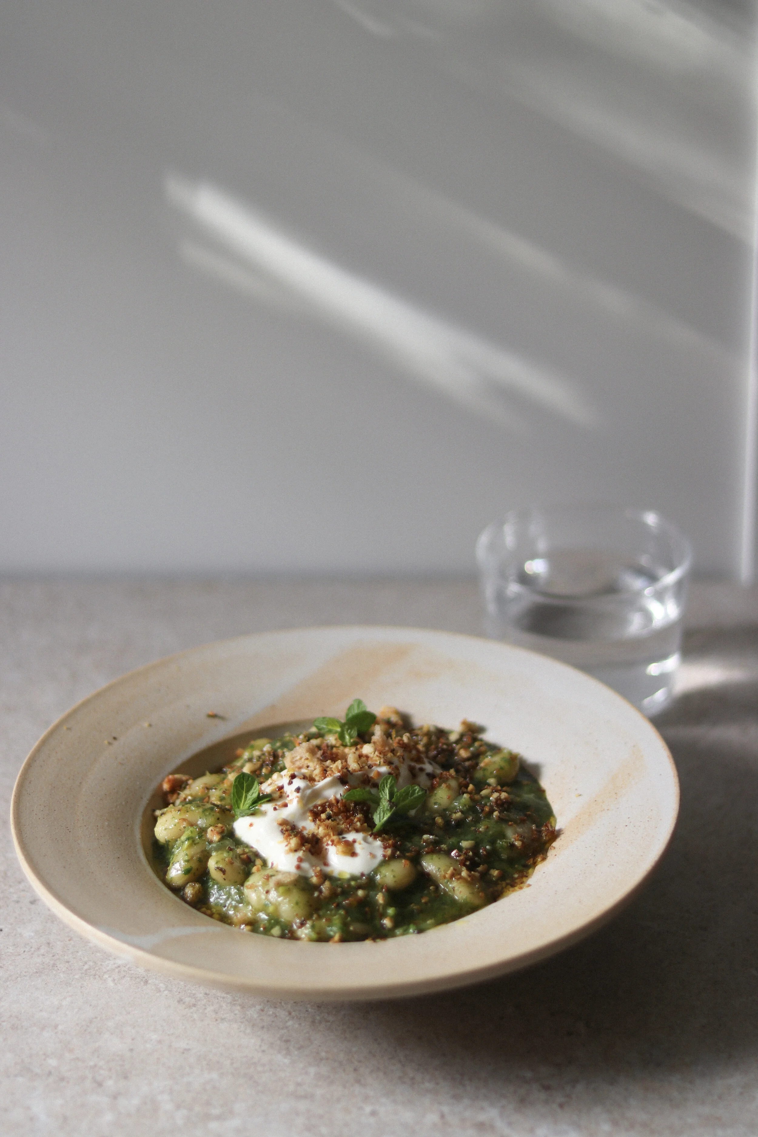 Nettle pesto beans with crème fraîche, hazelnut pangrattato and mint