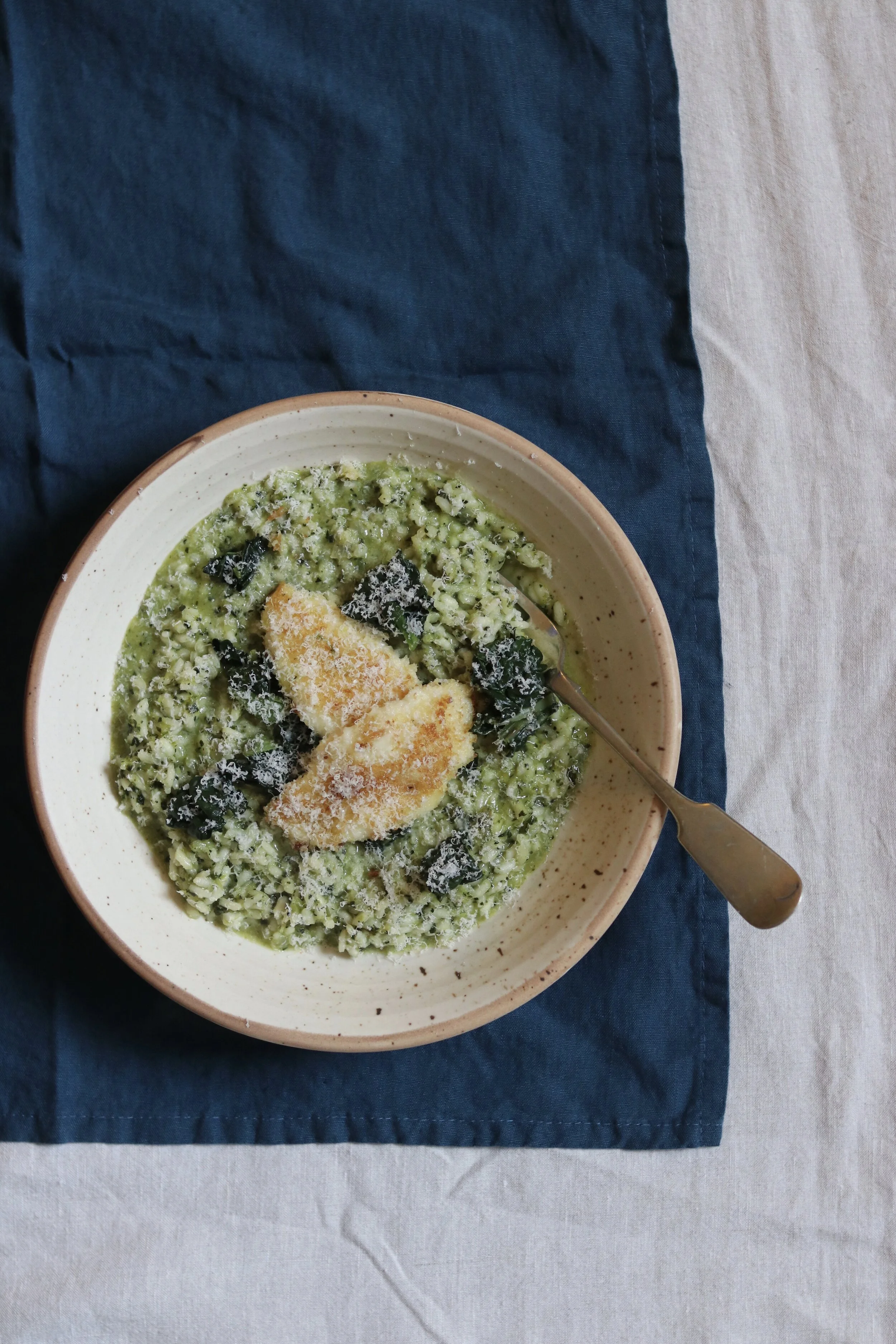 Risotto Verde can take many forms but I love the vibrancy my that my favourite leafy green brings to the table. The panko coated mozzerella is by no means traditional but adds some interesting textures to the finished dish and settles this as an autumnal take on a risotto verde.