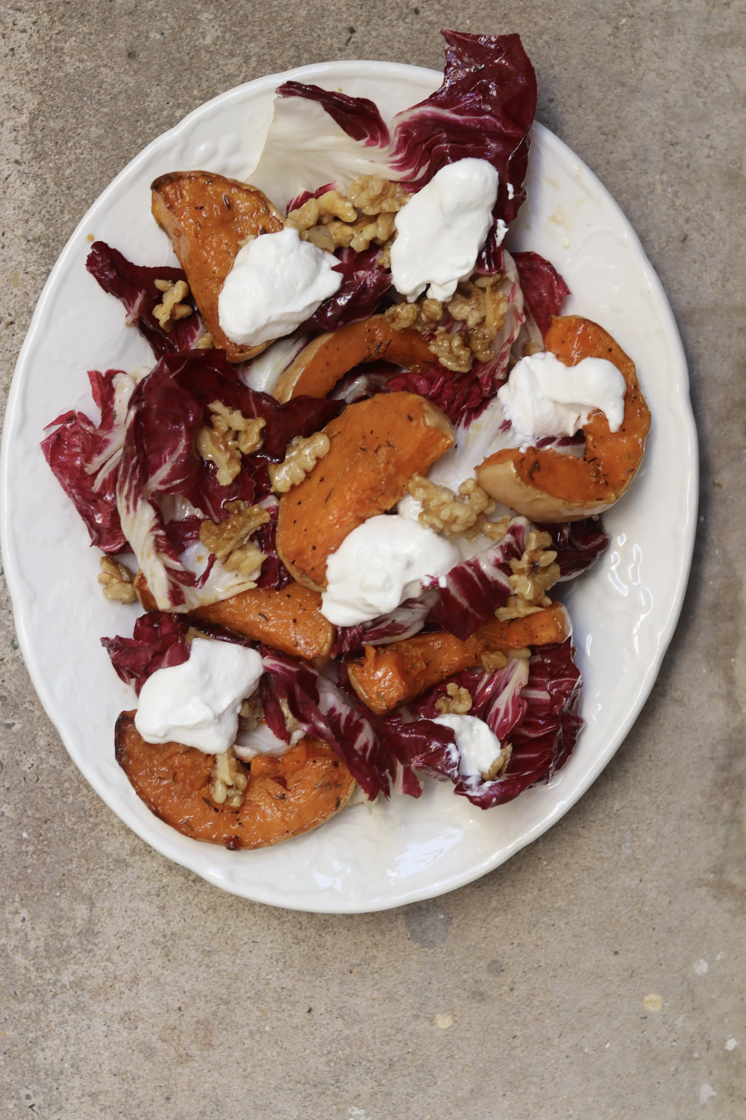 Squash, radicchio, goats curd and candied walnuts with a pomegranate molasses dressing